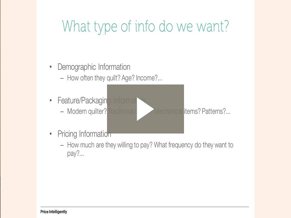 You can start to build your personas by asking questions to your customers. Not just any questions, however, you want to ask the right questions. It's important to gather demographic, feature, and pricing information. Here's an example below of what these questions potentially look like for someone running a quilting business. The main idea here is to find out what it is that people actually value so that you can align your pricing with those values.