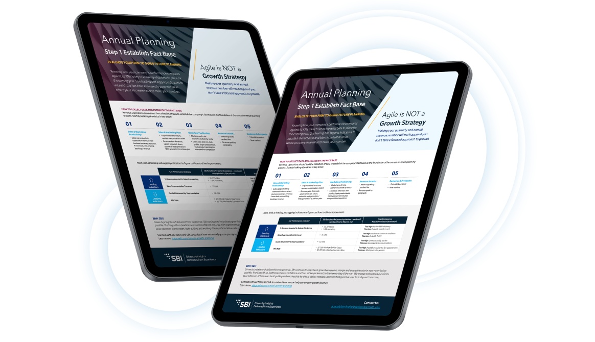 SBI’s Establish the Fact Base guide shows you how to collect, evaluate, and align your company’s performance data to form a clear foundation for the revenue planning process.