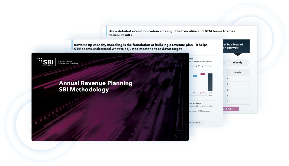 SBI’s Annual Revenue Planning program provides a structured five-step process that connects growth ambitions to actionable and measurable outcomes. Built from decades of advisory experience with leading B2B organizations, this methodology ensures every go-to-market (GTM) function—Marketing, Sales, Customer Success, and Product—works toward the same revenue goals.