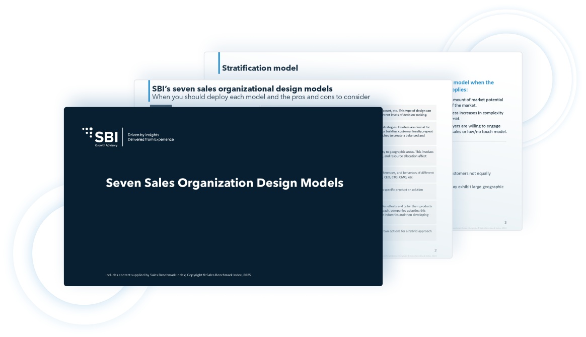 SBI’s Seven Sales Organization Design Models slides outline the most effective structures used by leading B2B organizations and when to deploy each. Each model includes its strengths, limitations, and practical use cases to help you select the right design for your business stage and go-to-market priorities.
